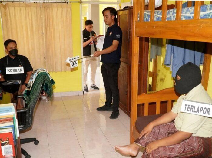 Rekonstruksi ini dilakukan di dua lokasi yang berbeda dengan total 65 adegan. Sebanyak 49 adegan di kamar pelaku yang melibatkan empat korban, dan 16 adegan di ruang Sekretariat Kampus.